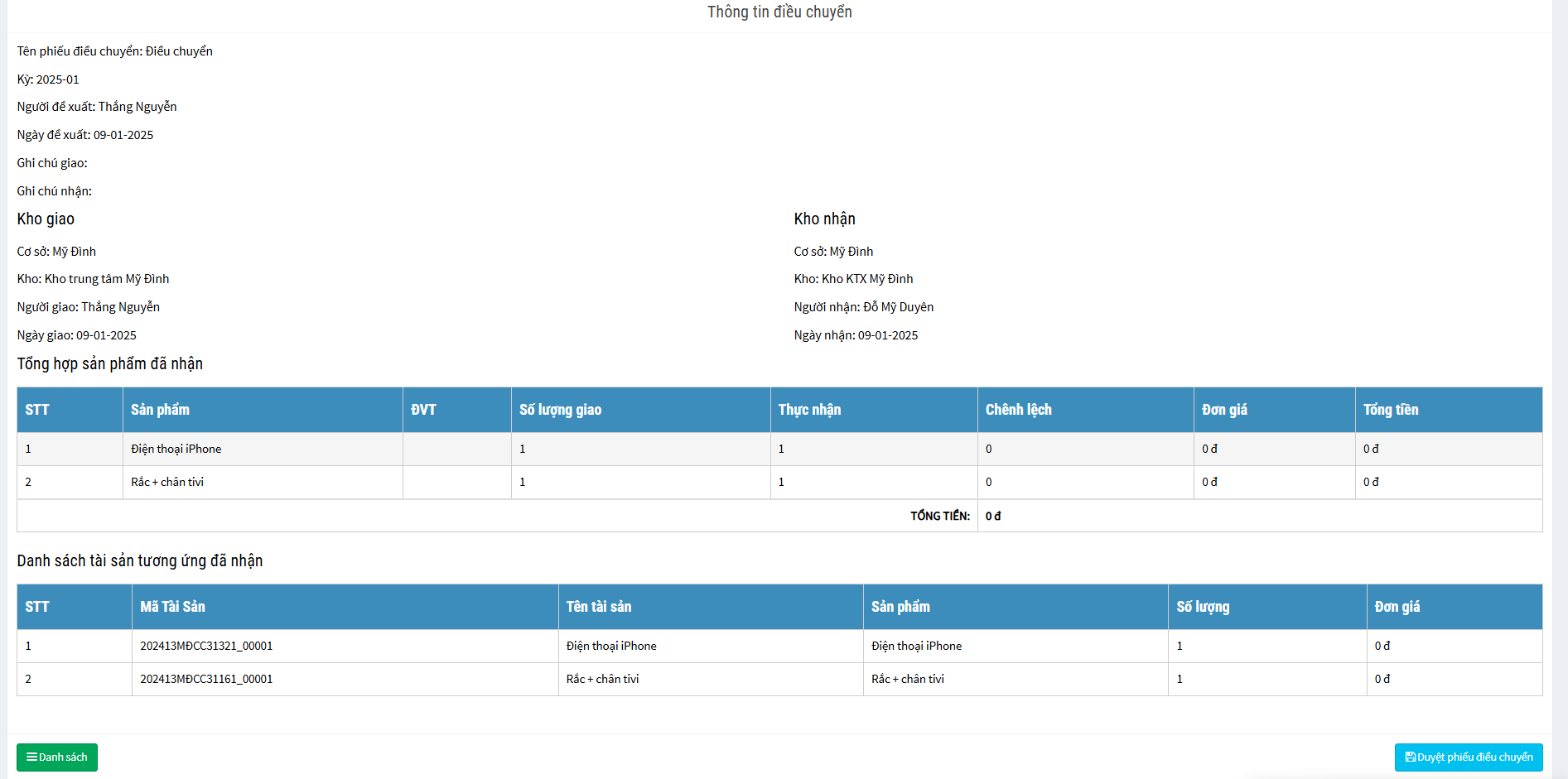 - Sau khi duyệt phiếu điều chuyển, sẽ thay đổi số lượng và vị trí tài sản trong kho