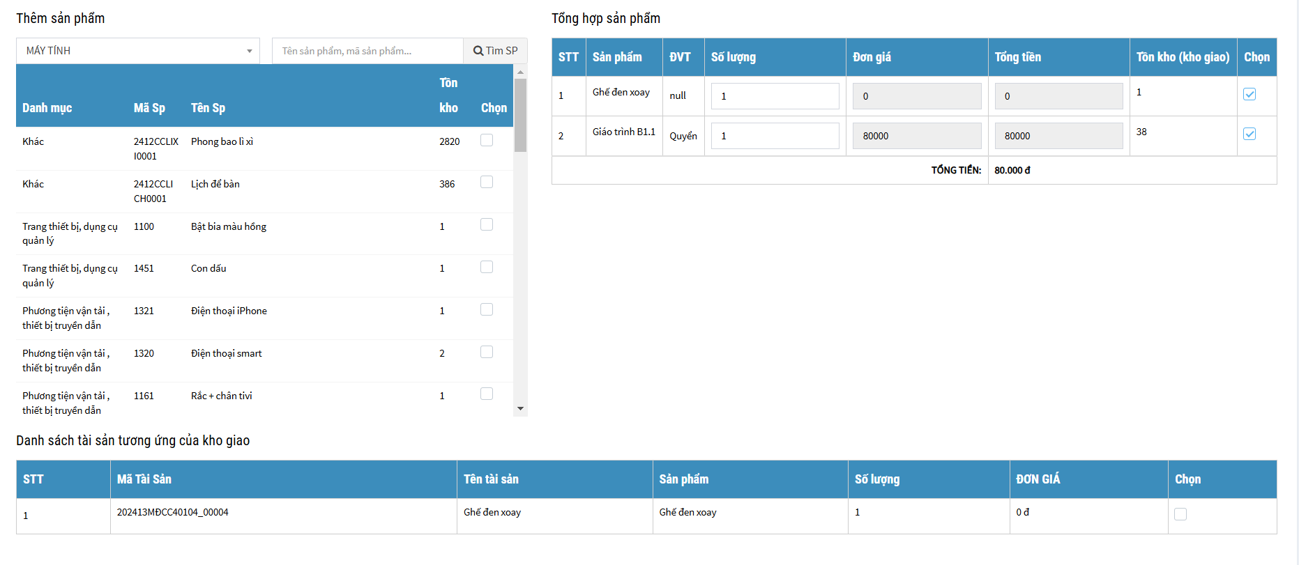 - Nếu sản phẩm điều chuyển thuộc tài sản hoặc c.cụ d.cụ thì cần chọn đúng số lượng tương ứng ở phần danh sách tài sản