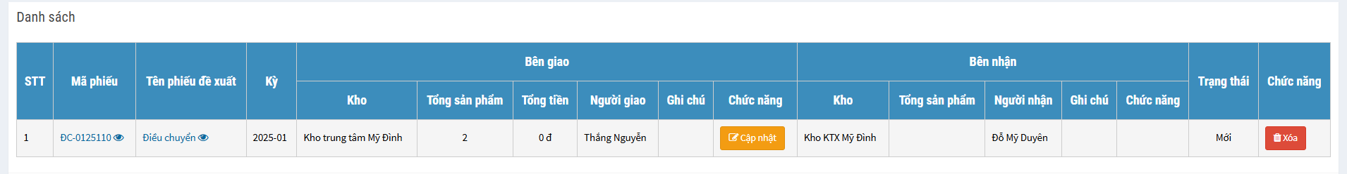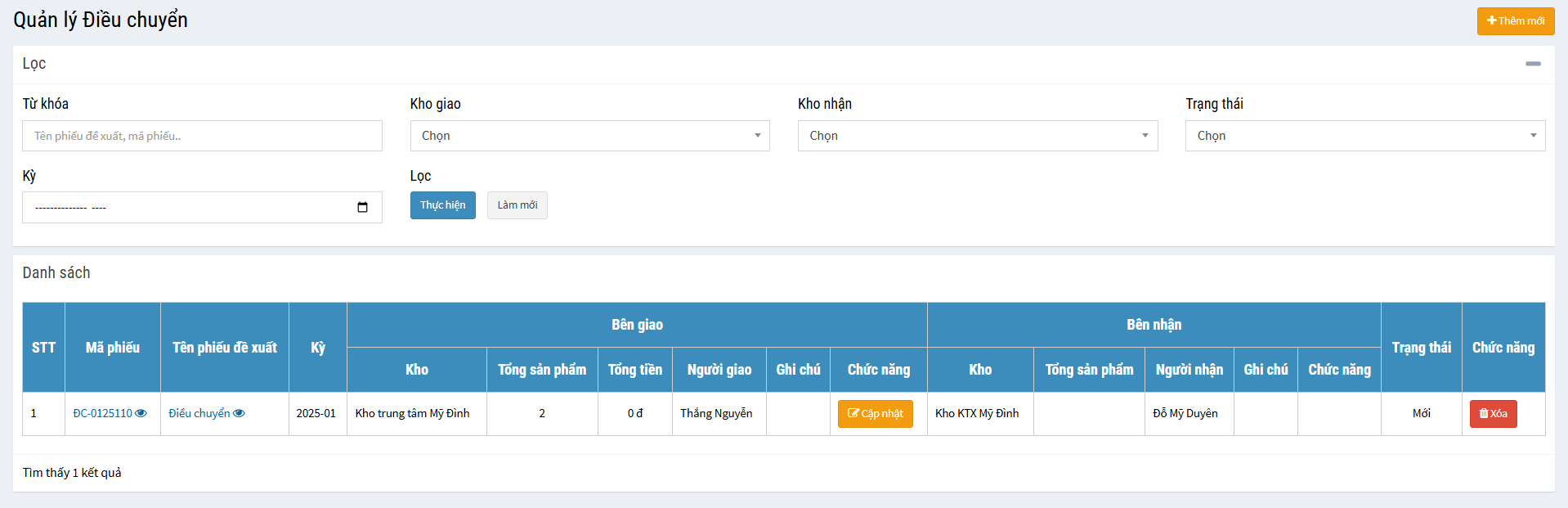 - Tại màn hình chính người dùng có thể lọc theo các thông tin như: mã phiếu, tên phiếu, kỳ, kho giao, kho nhận