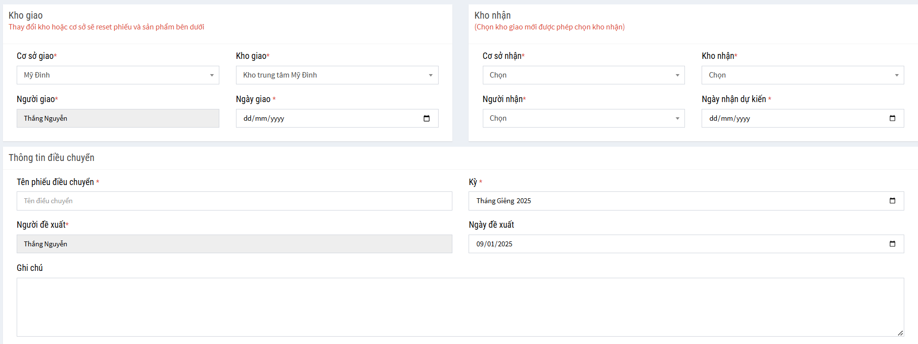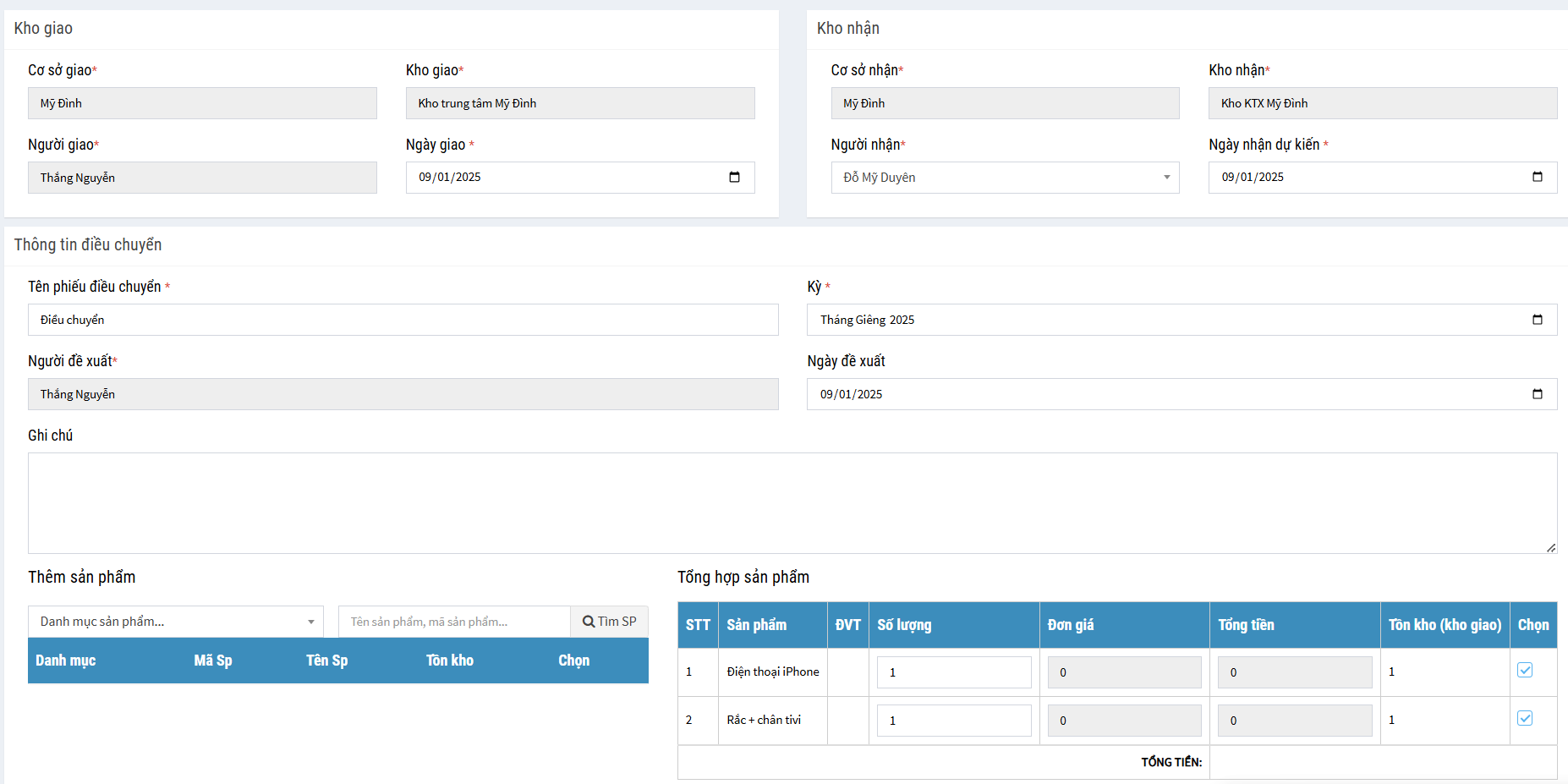 - Chọn sản phẩm điều chuyển sẽ lấy từ danh sách của kho giao