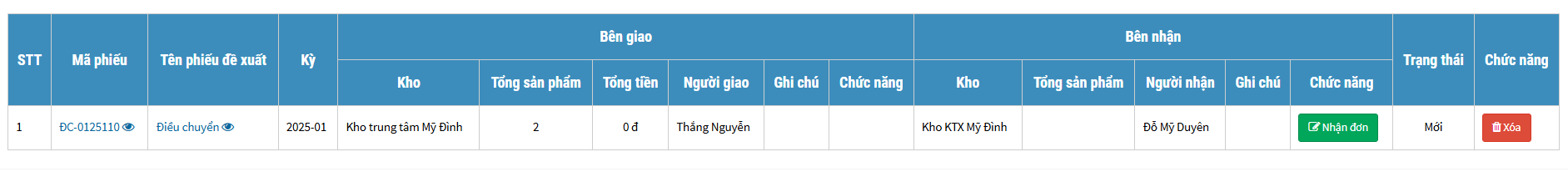 - Sau khi đã nhận đơn điều chuyển sẽ chuyển sang trạng thái đã nhận đơn và chờ duyệt và không thể chỉnh sửa
