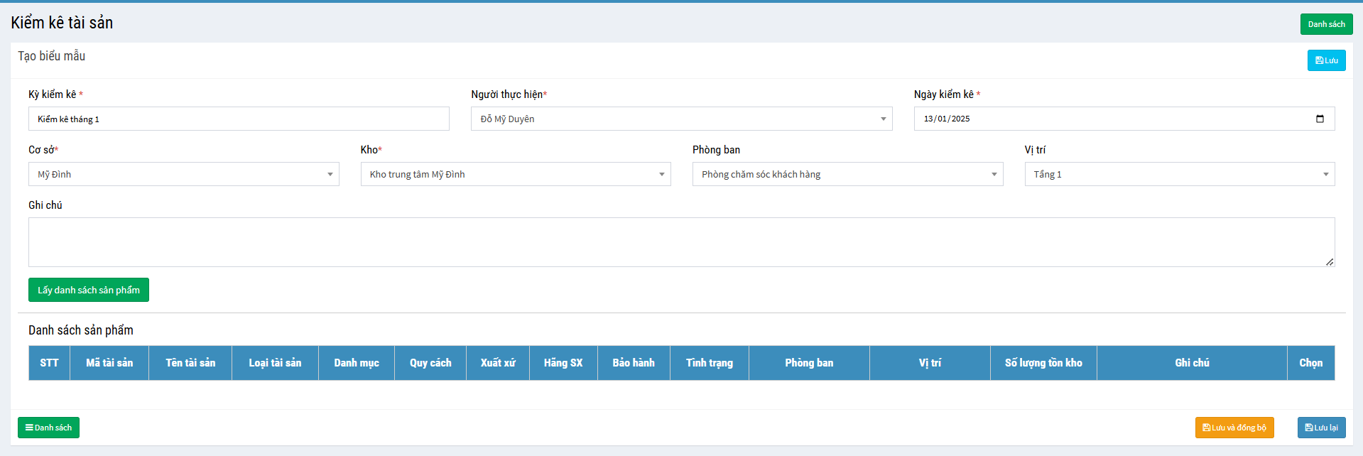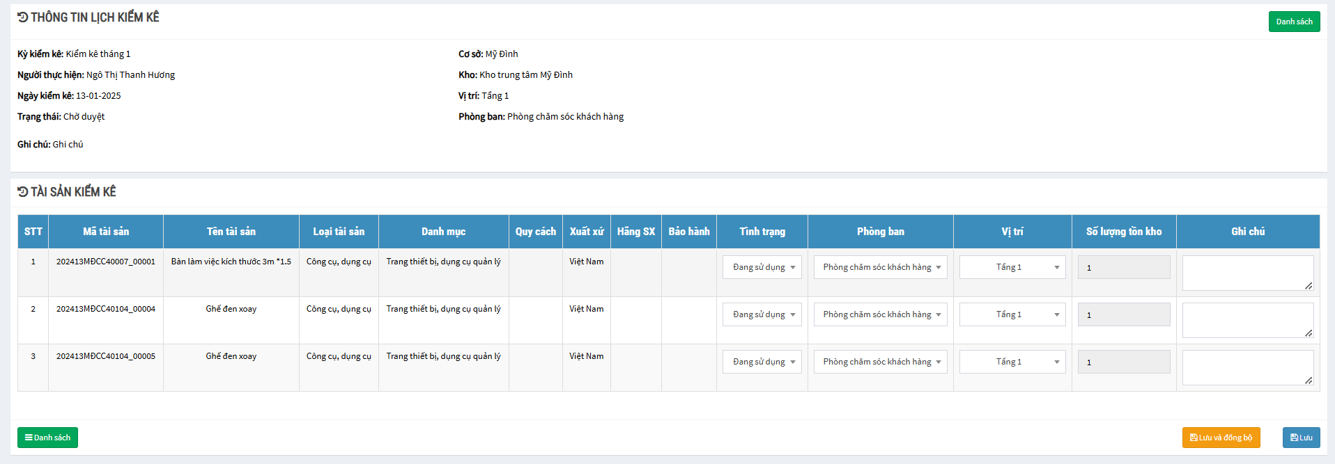 Lưu ý: Lưu và đồng bộ sẽ đổi lại số lượng tài sản trong hệ thống theo thông tin kiểm kê