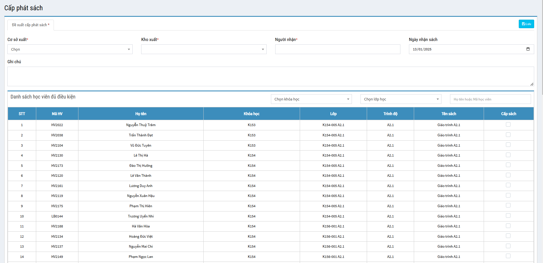 -  Người dùng cần cơ sở, kho, người nhận, ngày nhận và chọn học sinh cần phát sách