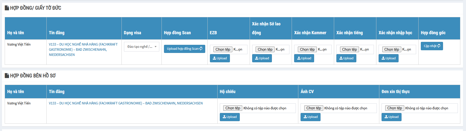 Hiển thị tất cả các hồ sơ ứng tuyển của học viên vào tin đăng. Để cập nhật trạng thái hồ sơ và dữ liệu file hồ sơ người dùng ấn vào nút