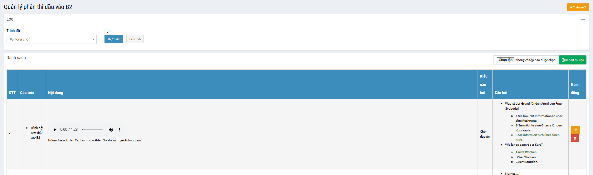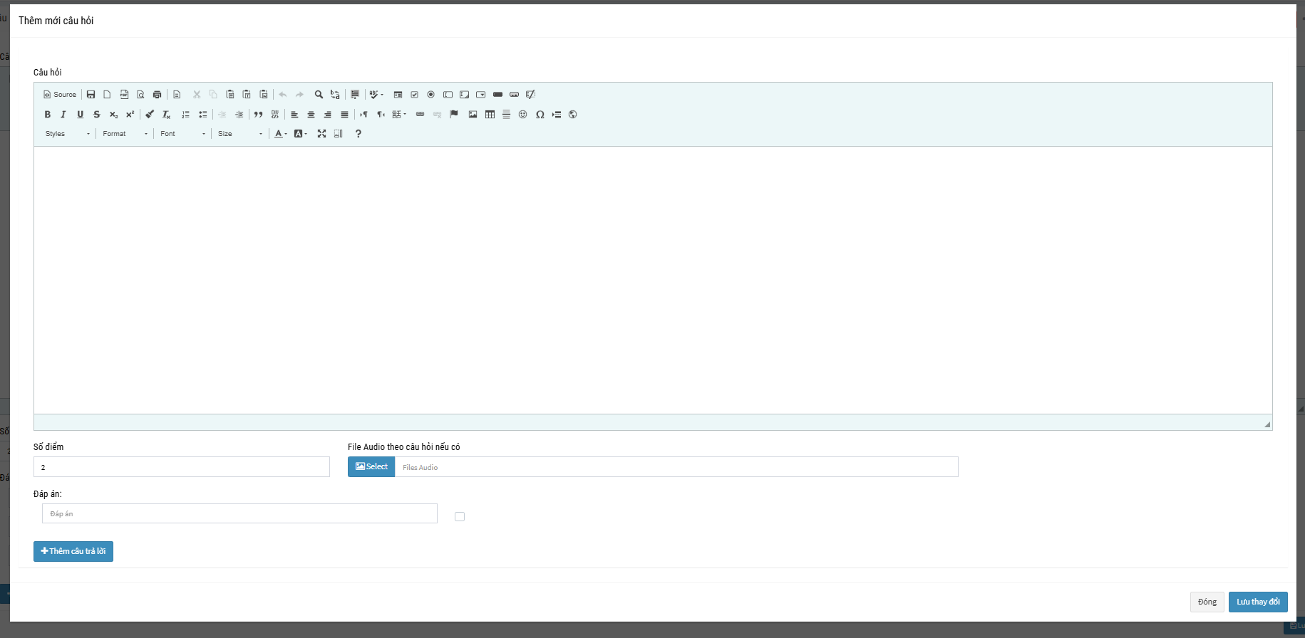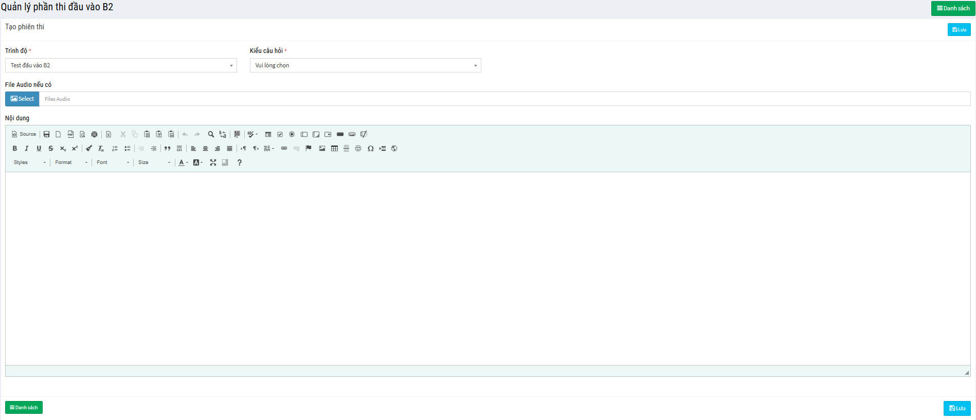 Tại  màn hình thêm mới người dùng sẽ tạo đề trước, với các thông tin như trình độ, kiểu câu hỏi, nội dùng đề và file audio nếu có