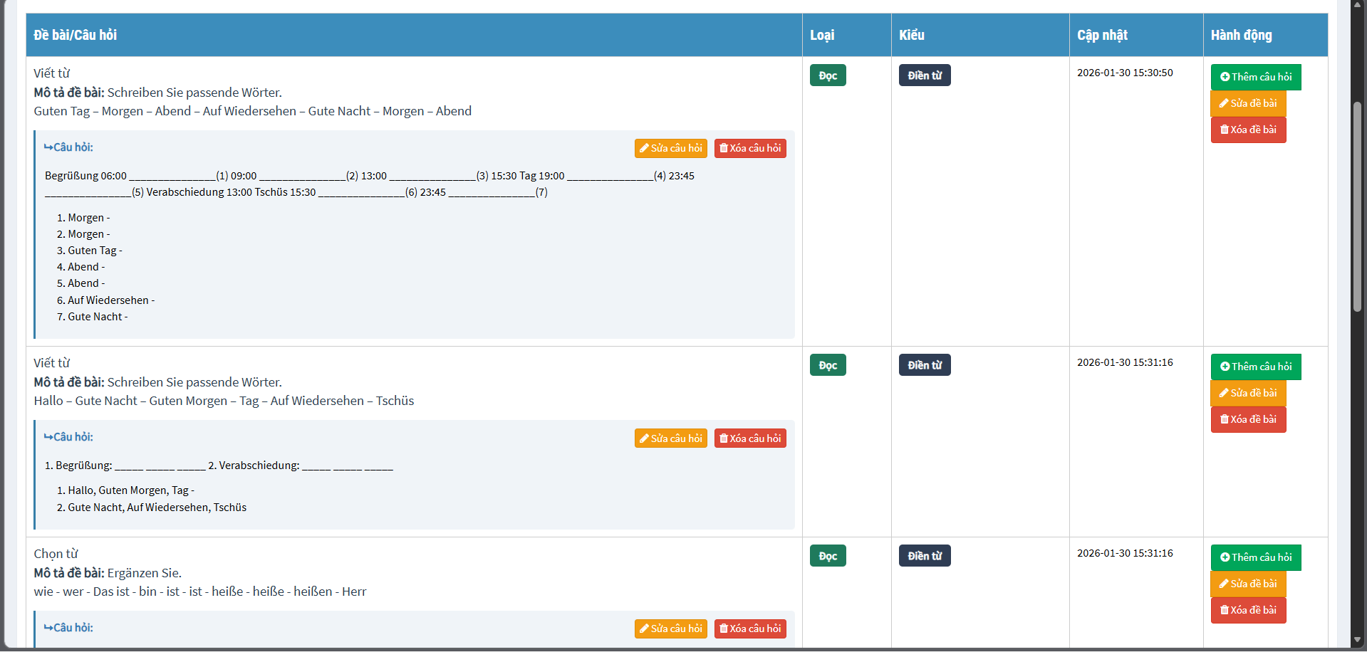 - Các nút thao tác: Thêm câu hỏi, Sửa, Xóa (nằm cạnh mỗi đề bài hoặc câu hỏi)