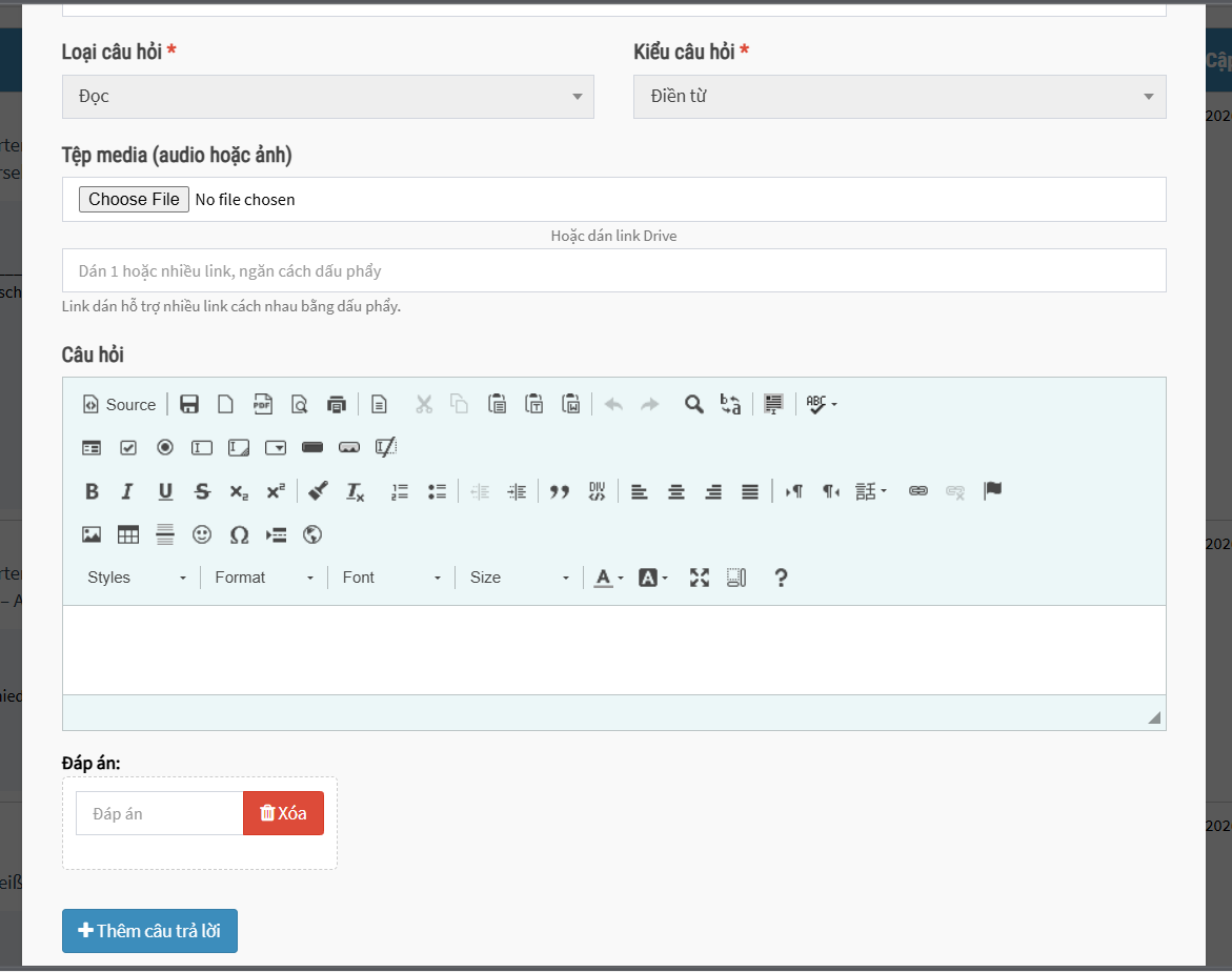 Chọn và nhập Đáp án tương ứng với dạng câu hỏi.