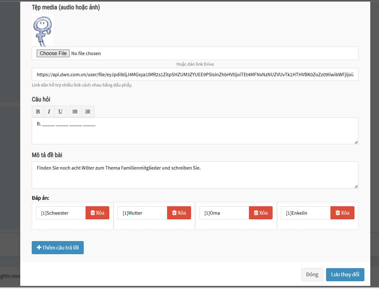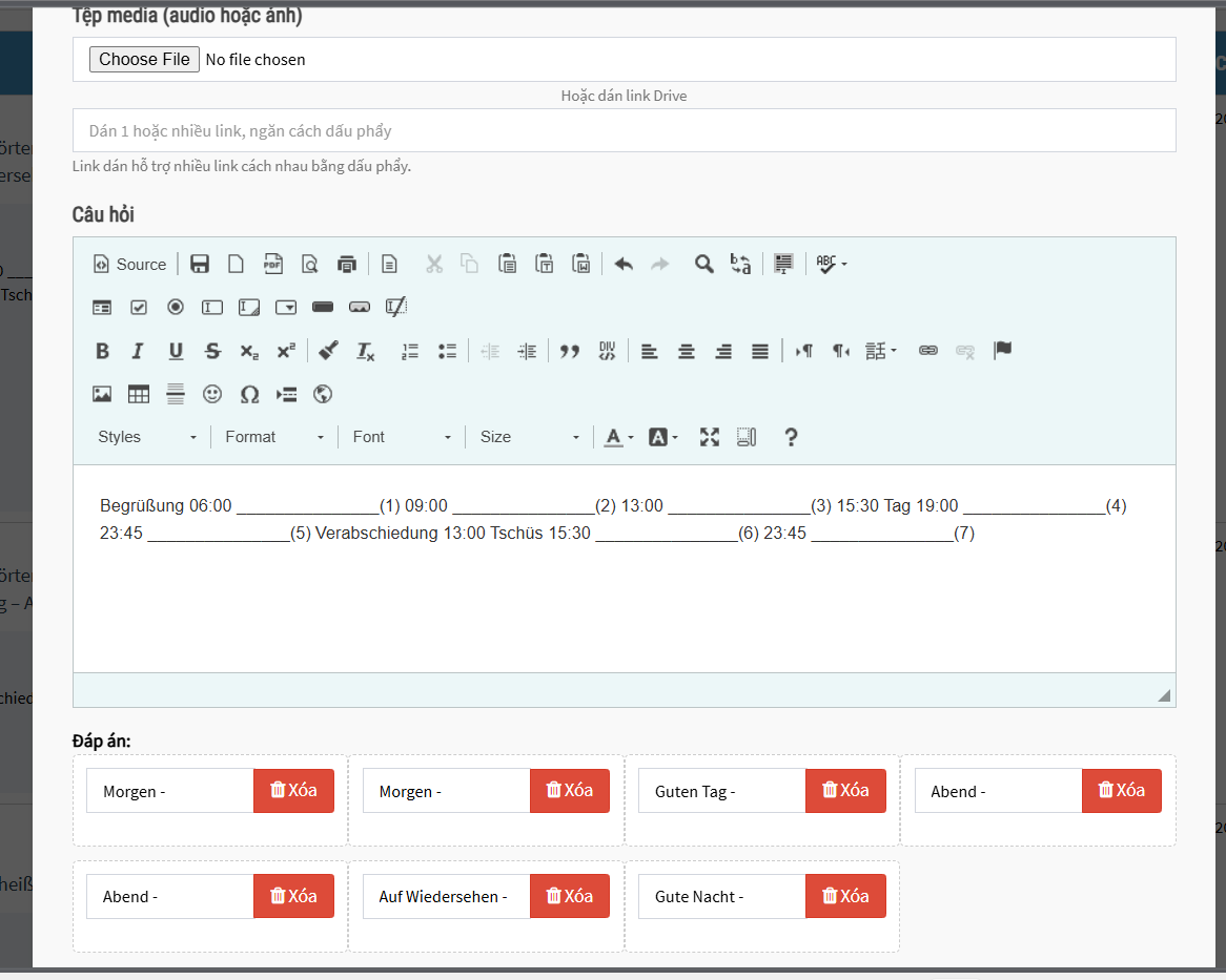 Mỗi ô ở vế Trái hoặc vế Phải đều có thể điền: Chữ (Text), Link âm thanh, hoặc Link hình ảnh.