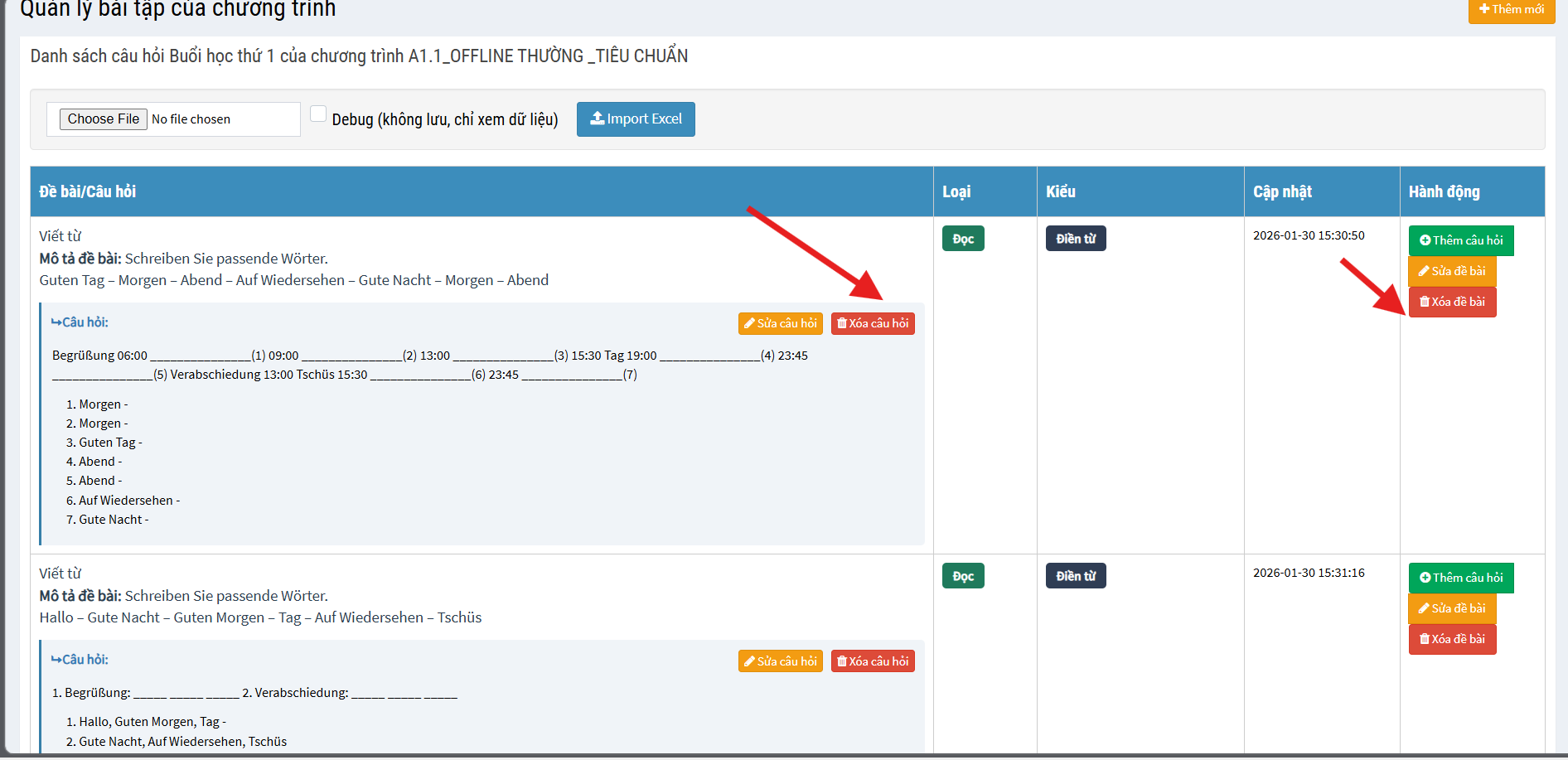 Xóa Đề bài: Bấm nút Xóa ở dòng đề bài ➔ Xác nhận xóa. (Lưu ý: Xóa đề bài sẽ xóa luôn toàn bộ các câu hỏi con nằm trong đề bài đó).