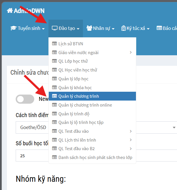 Chọn menu “Đào tạo -> Quản lý chương trình”