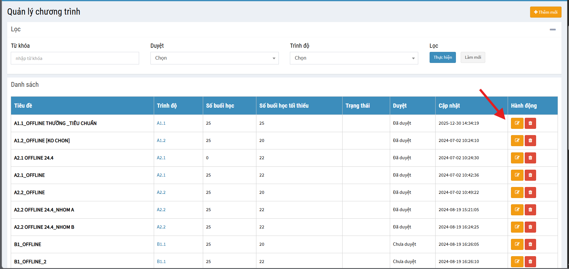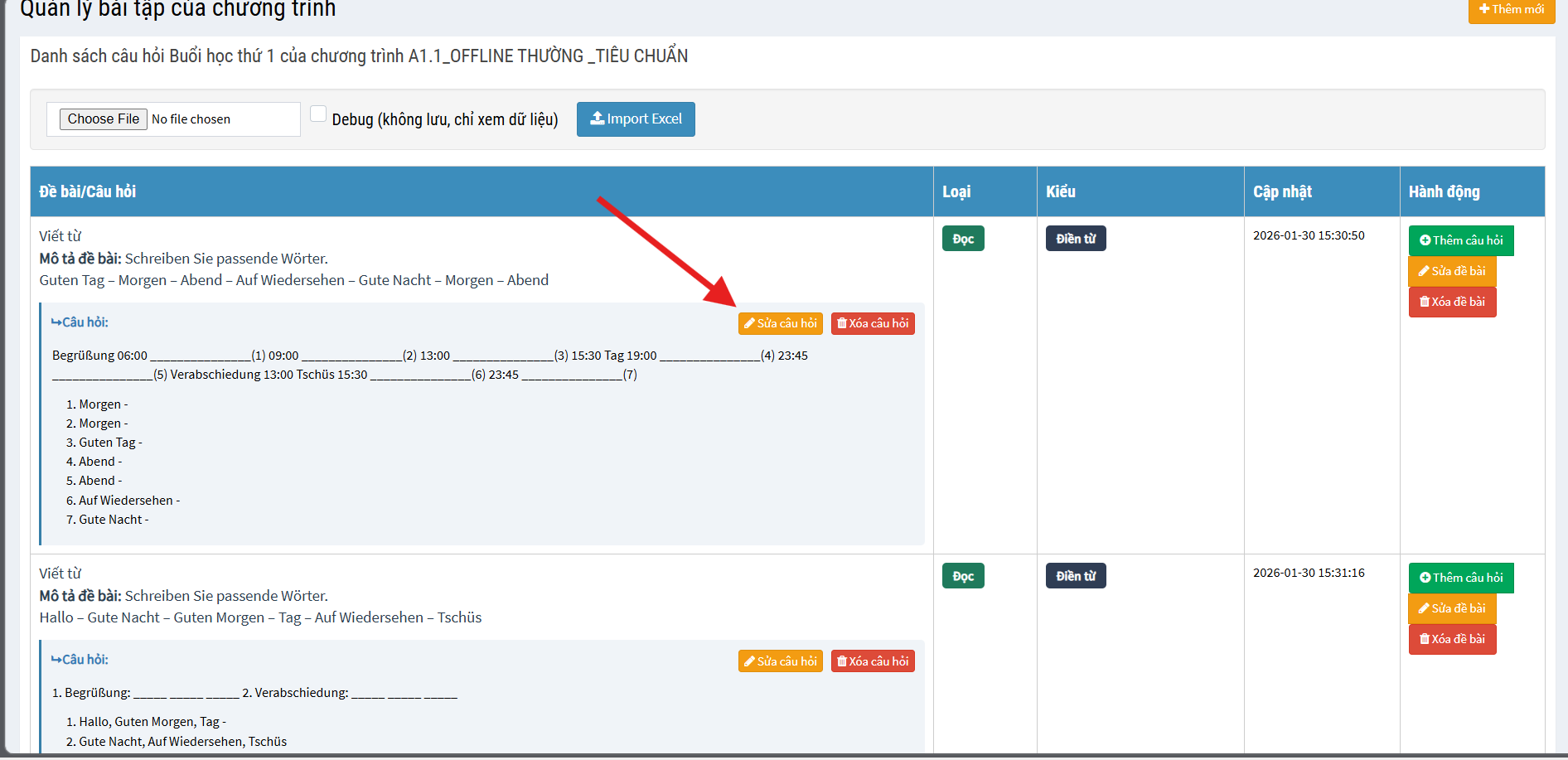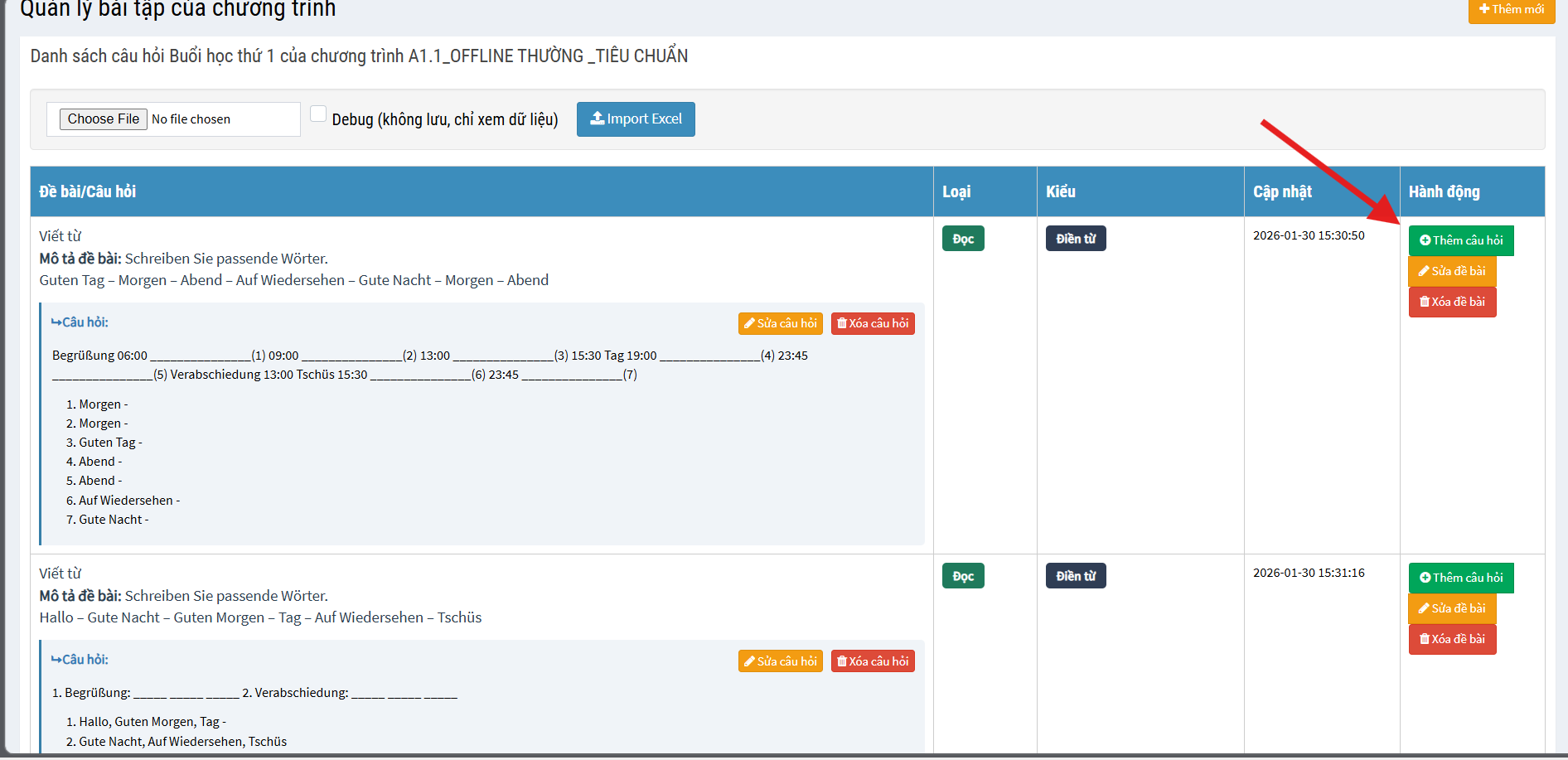 Xóa Câu hỏi: Bấm nút Xóa ở dòng câu hỏi tương ứng ➔ Xác nhận xóa.