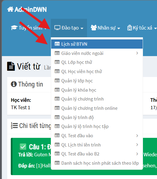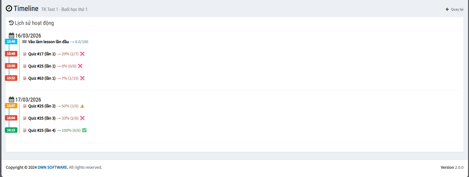 Trang Lịch sử luyện tập giúp giáo viên theo dõi quá trình học tập và luyện đề của từng học viên. Bạn có thể: