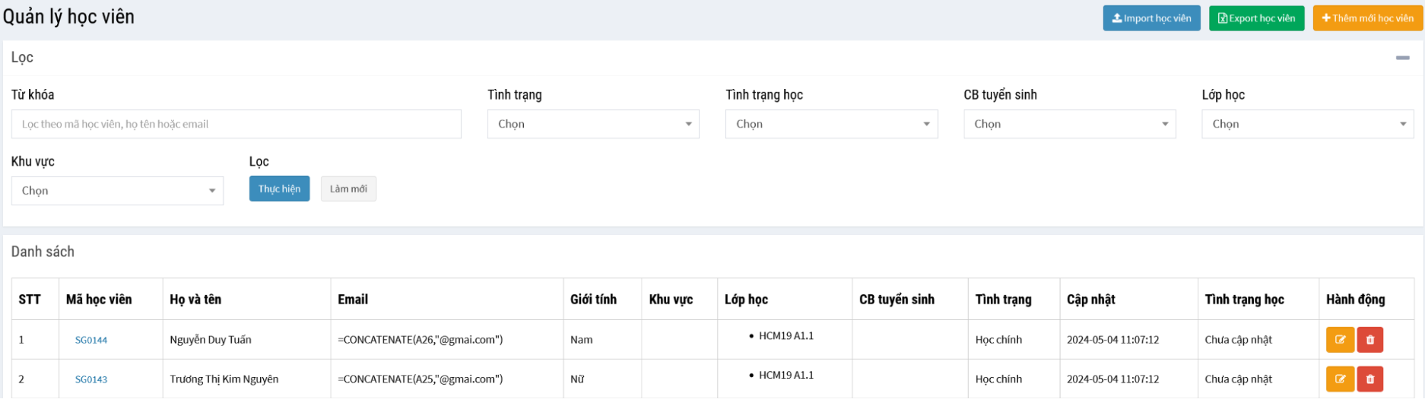 • Hệ thống sẽ tạo mới các học viên khi mã học viên trống hoặc chưa có trên hệ thống