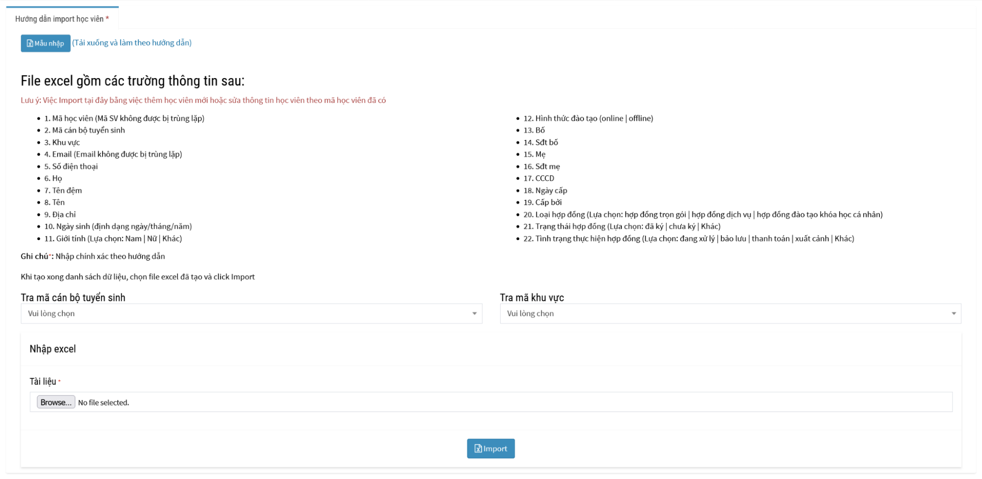 • Chỉ thực hiện import cập nhật thông tin học viên ở màn hình import dành cho Admin