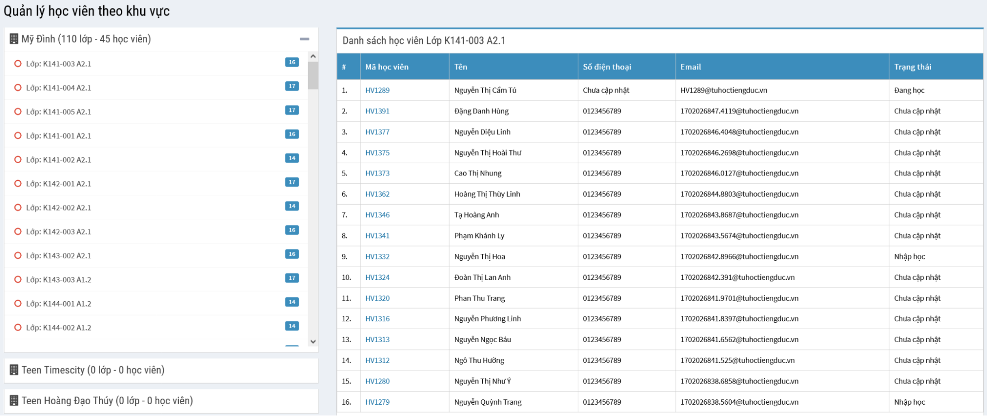 • Màn hình quản lý hiển thị thông tin học viên theo các khu vực do tài khoản đăng nhập được phân quyền xem và quản lý