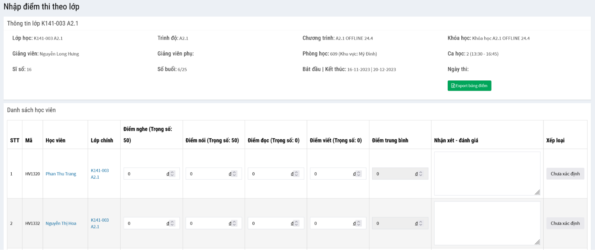 • Trong màn hình quản lý danh sách lớp, nhấn chọn nút Nhập điểm thi với lớp muốn thao tác, hệ thống hiển thị thông tin chi tiết lớp học và danh sách học viên của lớp đó