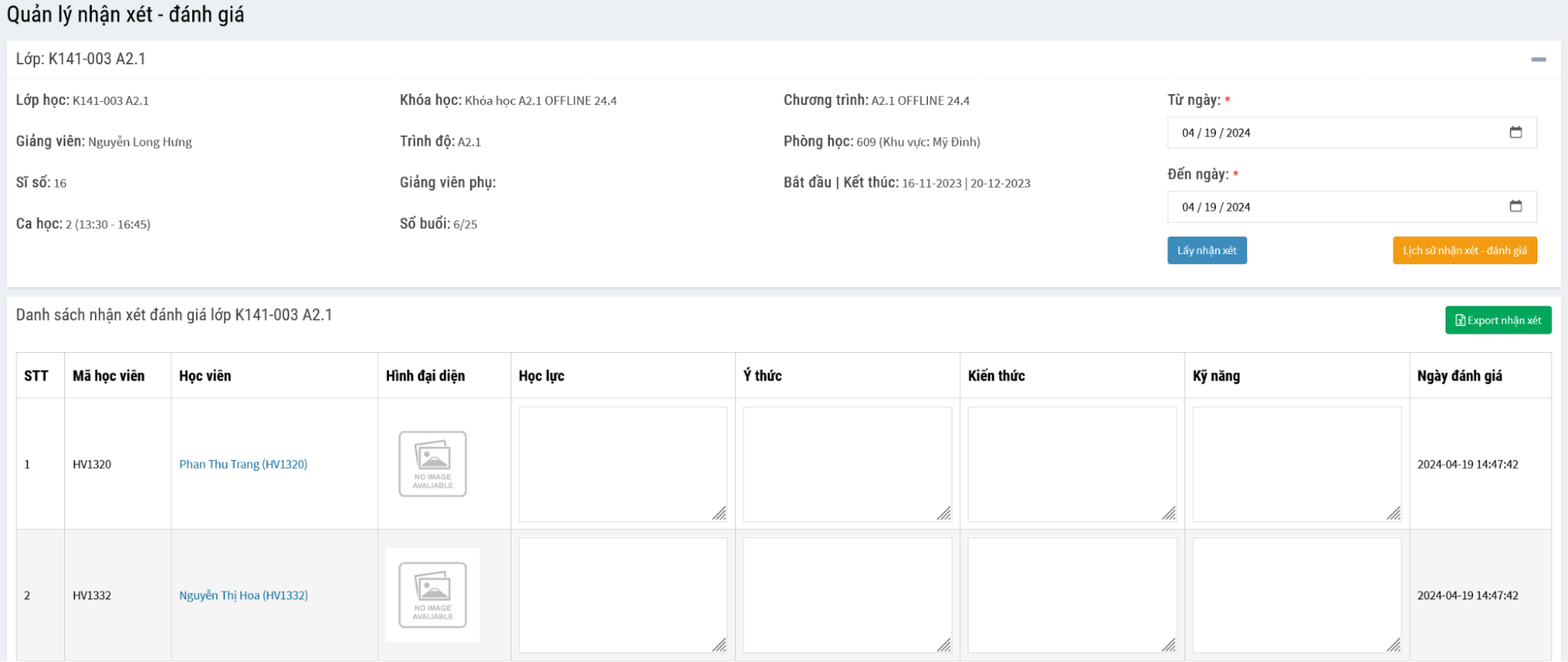 • Trong màn hình quản lý danh sách lớp, nhấn chọn nút Nhận xét - Đánh giá với lớp muốn thao tác, hệ thống hiển thị thông tin chi tiết lớp học và các chức năng: