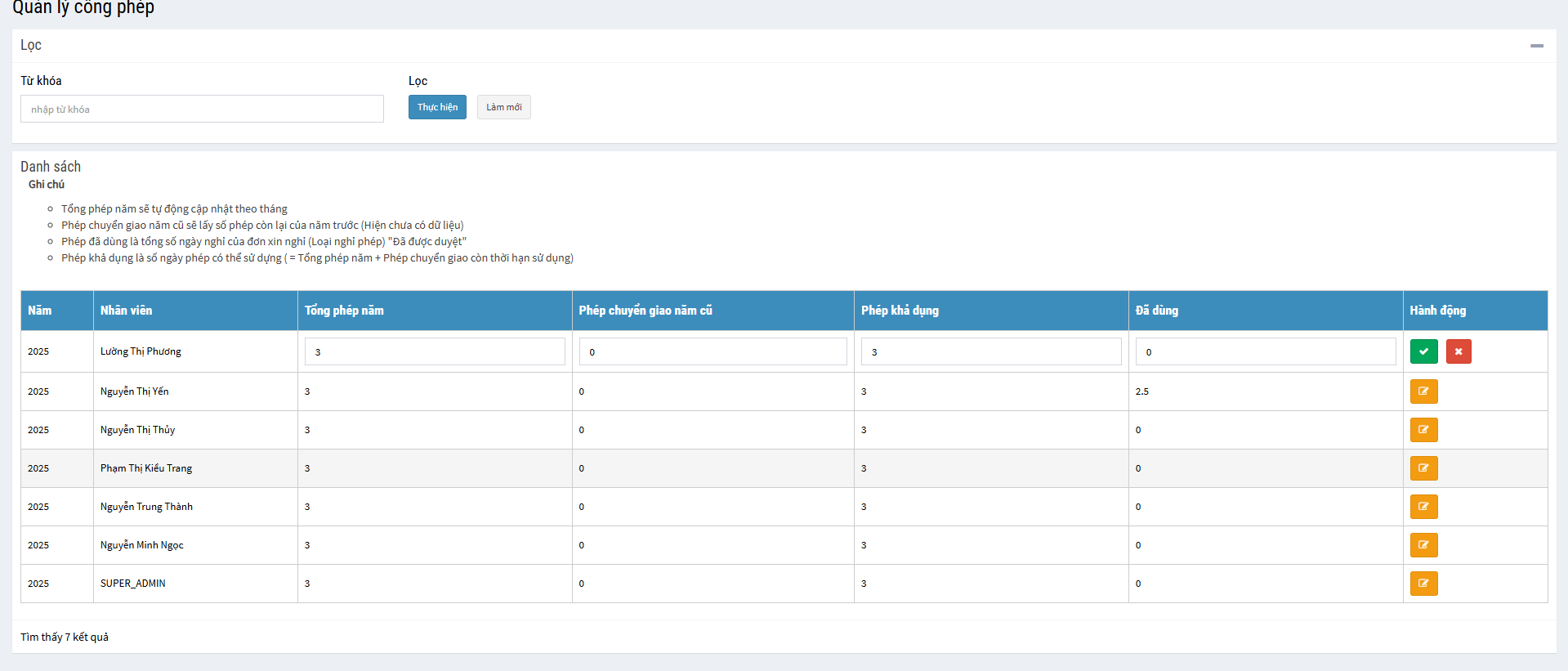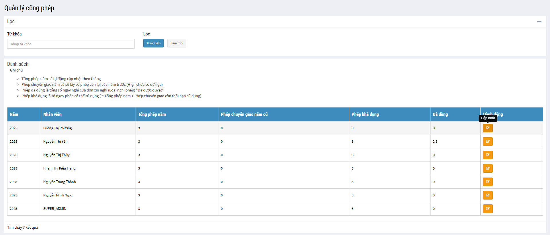 => Tại giao diện chính người dùng có thể lọc để lấy danh sách nhân viên tương ứng và cập nhật lại các thông số cho từng cán bộ nhân viên