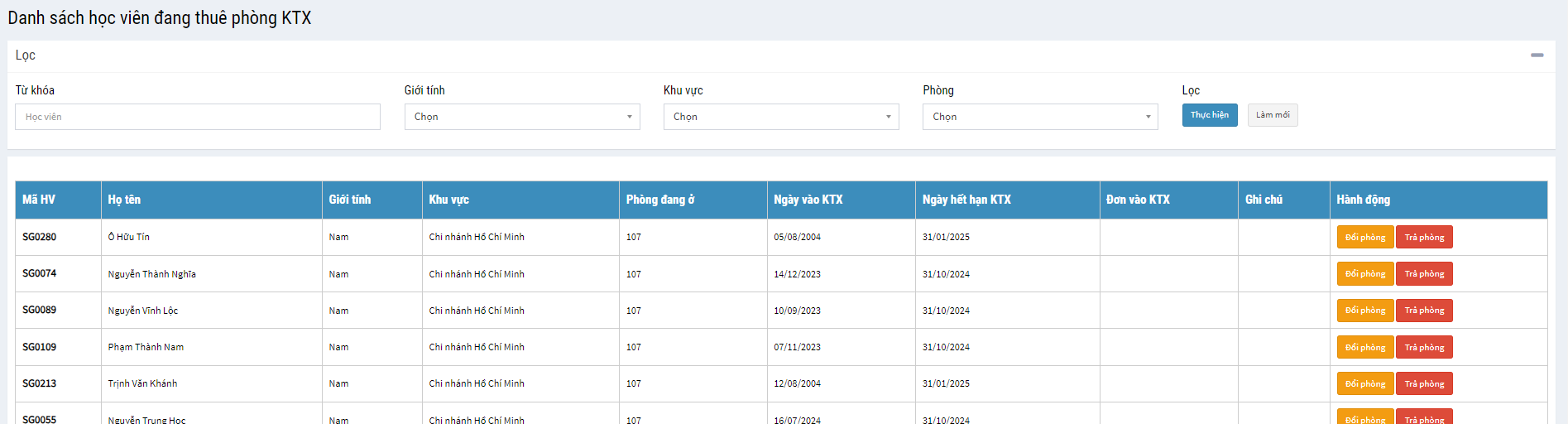 - 25.9. Danh sách học viên đang thuê phòng KTX (Dành cho quản sinh)